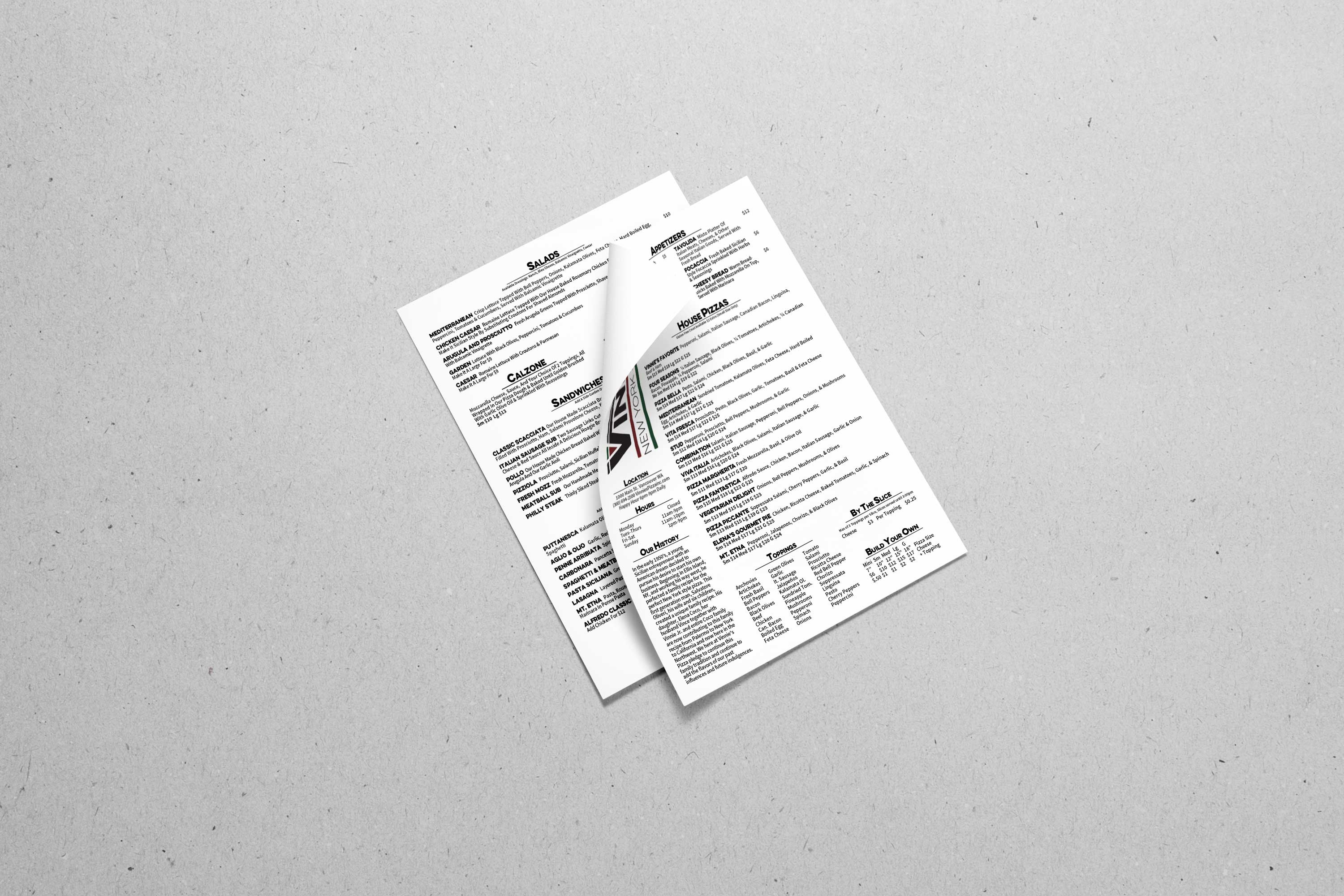 When SLTFNDRY was brought on for this project, Vinnie’s Pizza Vancouver had a very strong menu with delicious options, but not very much brand consistency. We assisted Vinnie with setting a new standard for a clean and modern style. We were pleased to provide branding services and add consistency to Vinnie’s. Giving the restaurant a new look, fitting to their recently remodeled downtown vancouver location, allowed Vinnie to focus on quality of service instead of the look of the business. We were able to completely rebrand Vinnie’s, with a new logo, business cards, & a full range of food and drink menus. We also provided a variety of additional auxiliary graphics such as a trinacria (italian character) and posters for vancouver local events.